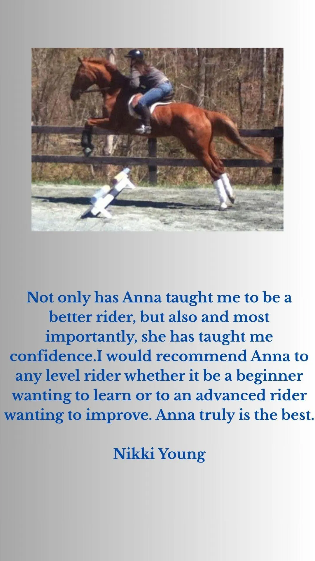 "As a classic overachiever with a PhD and USDF Silver Medal, I've always thrived on goals. But my new horse didn't respond to pressure. Anna helped me slow down and truly listen — to myself and to him. Now I have not just tools, but trust."